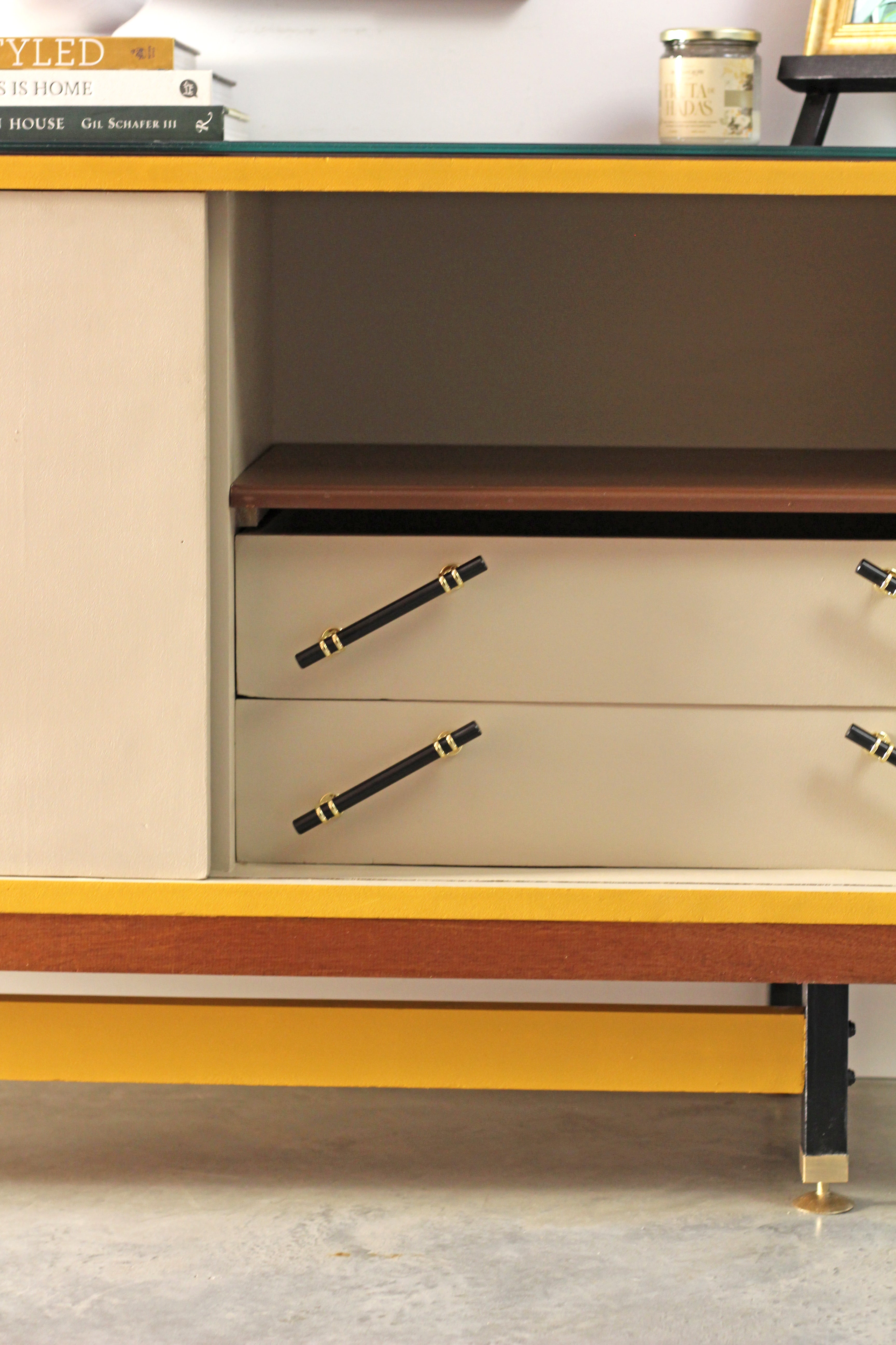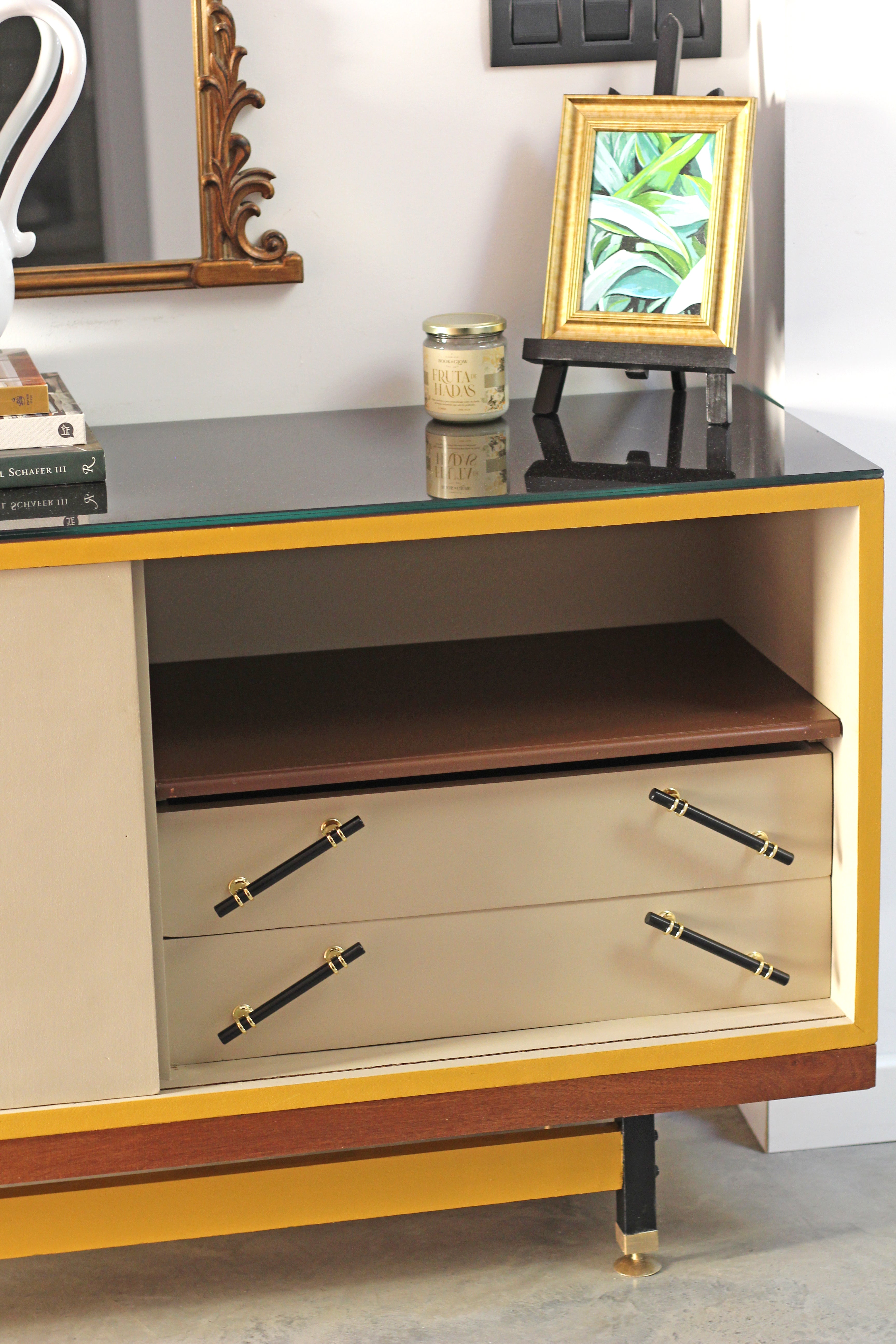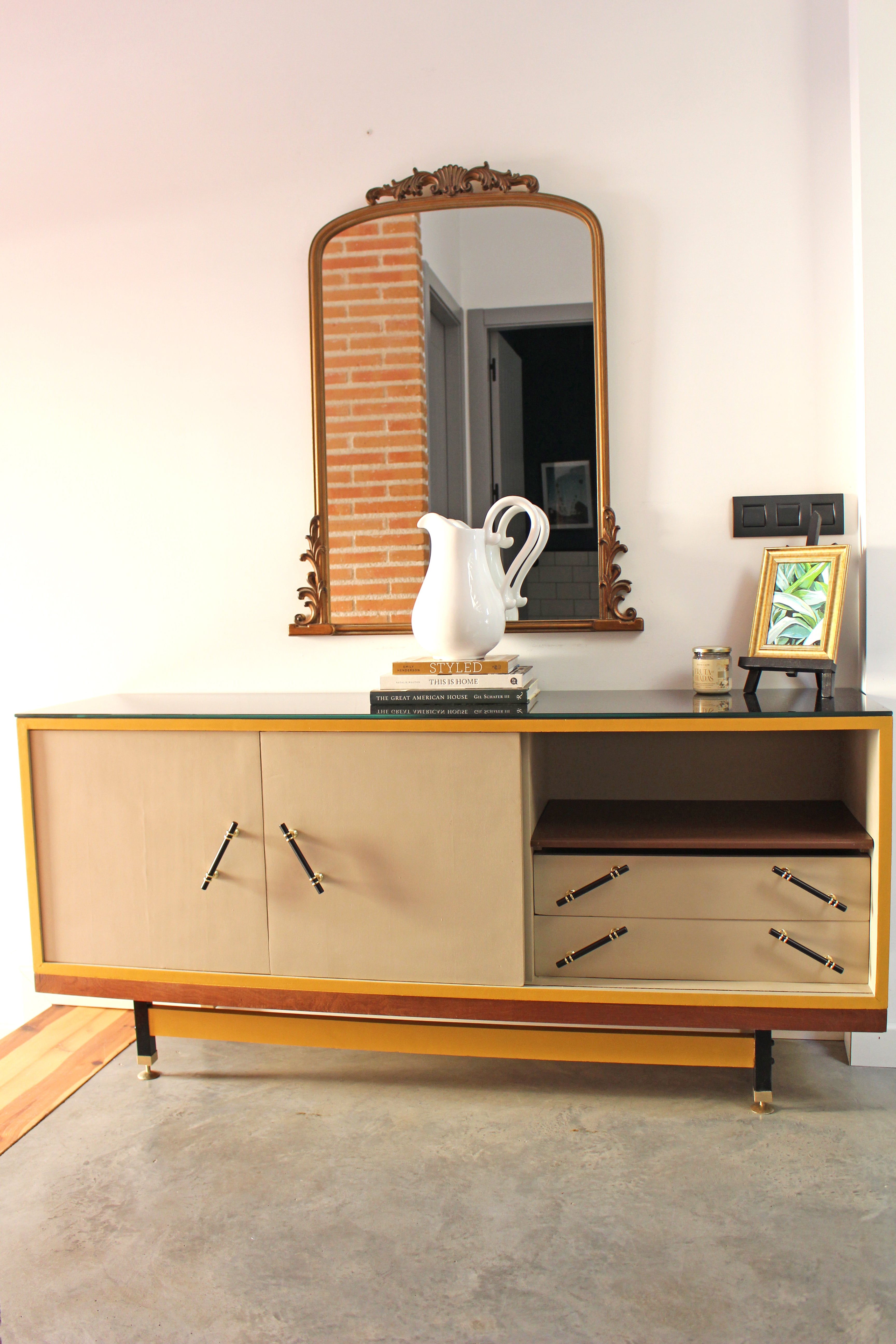 Aparador de estética mediados de siglo XX, el cual se caracteriza por líneas y acabados limpios de estética sencilla y sin demasiada decoración, así como por su funcionalidad.