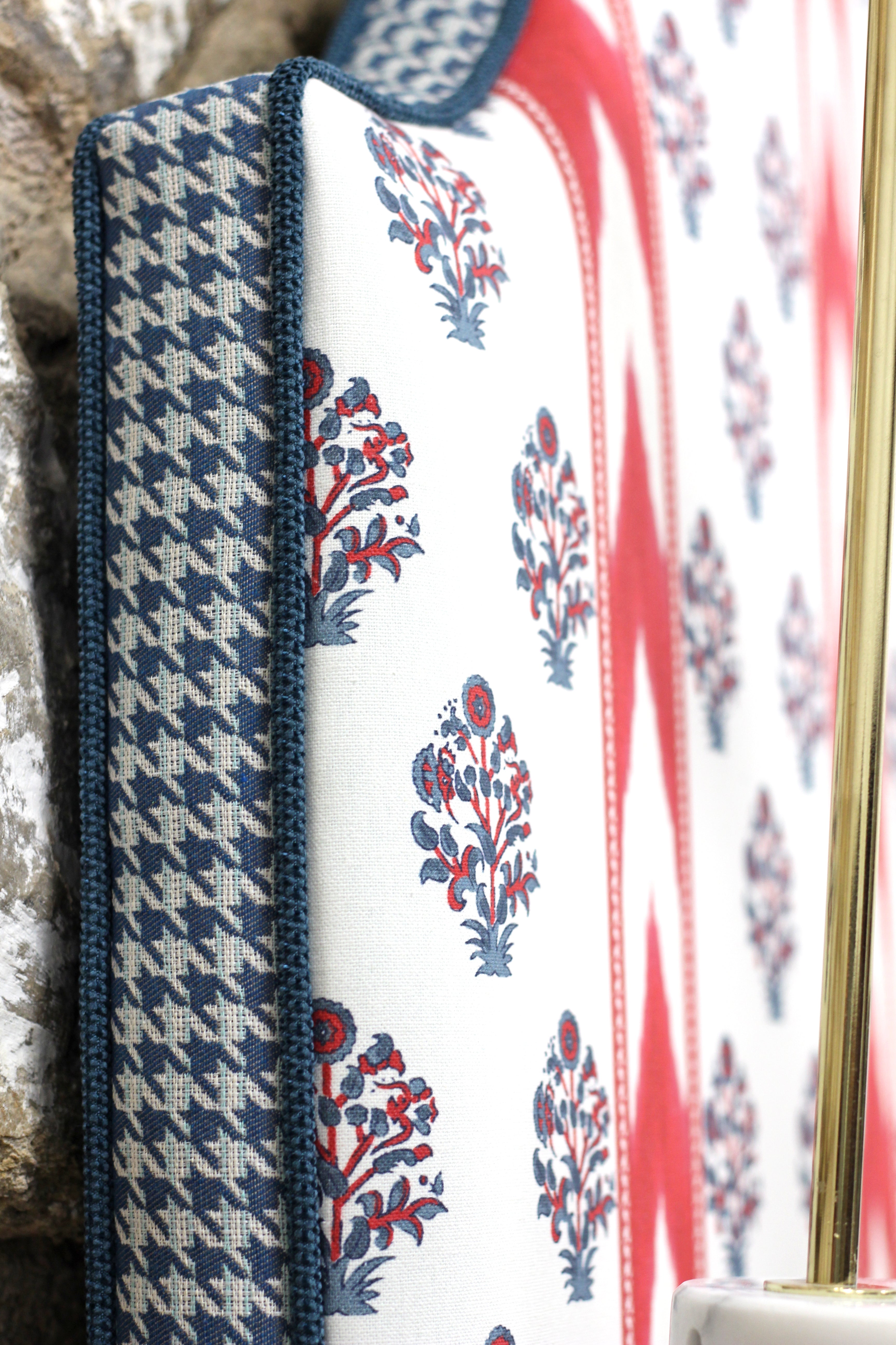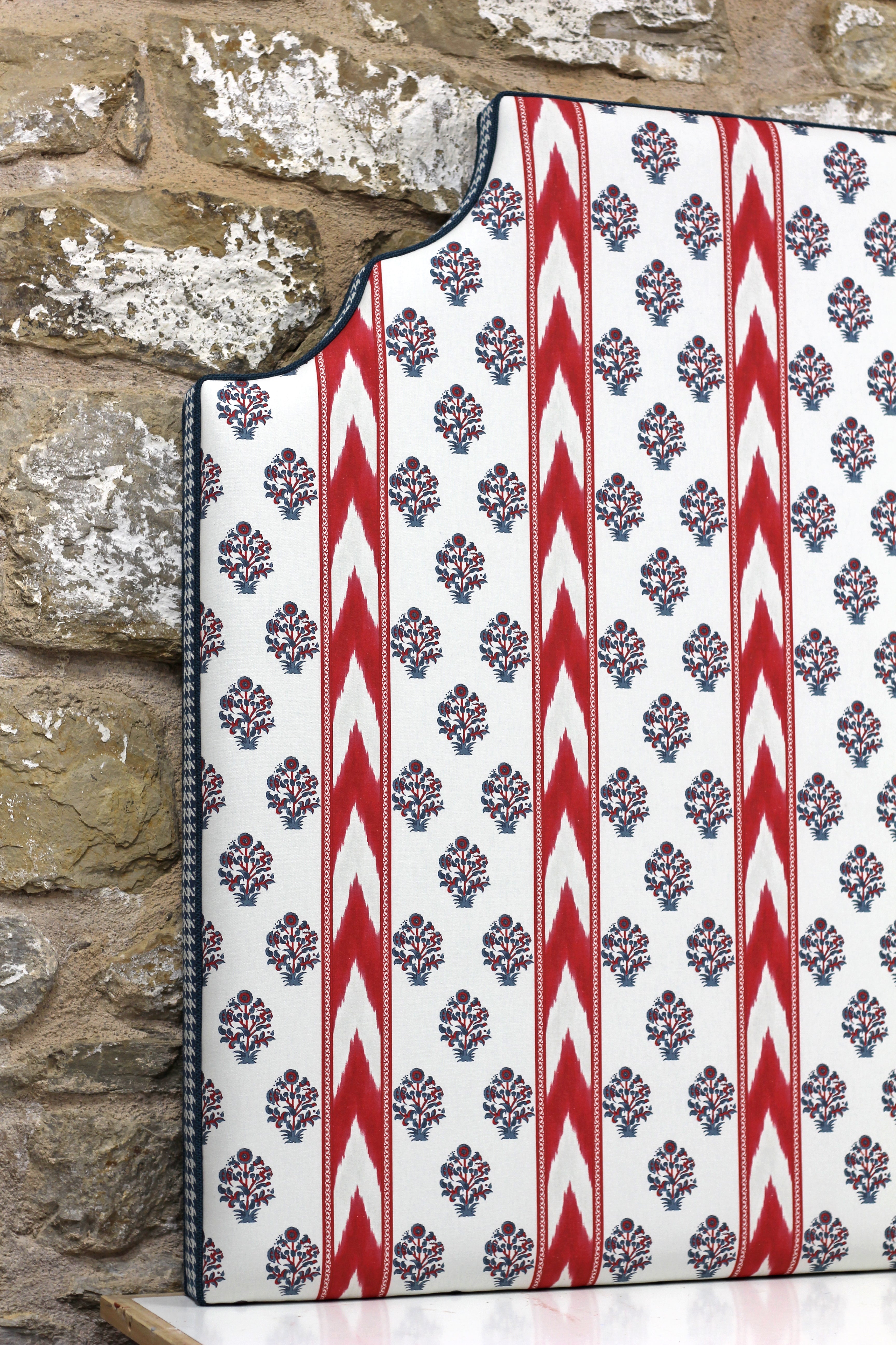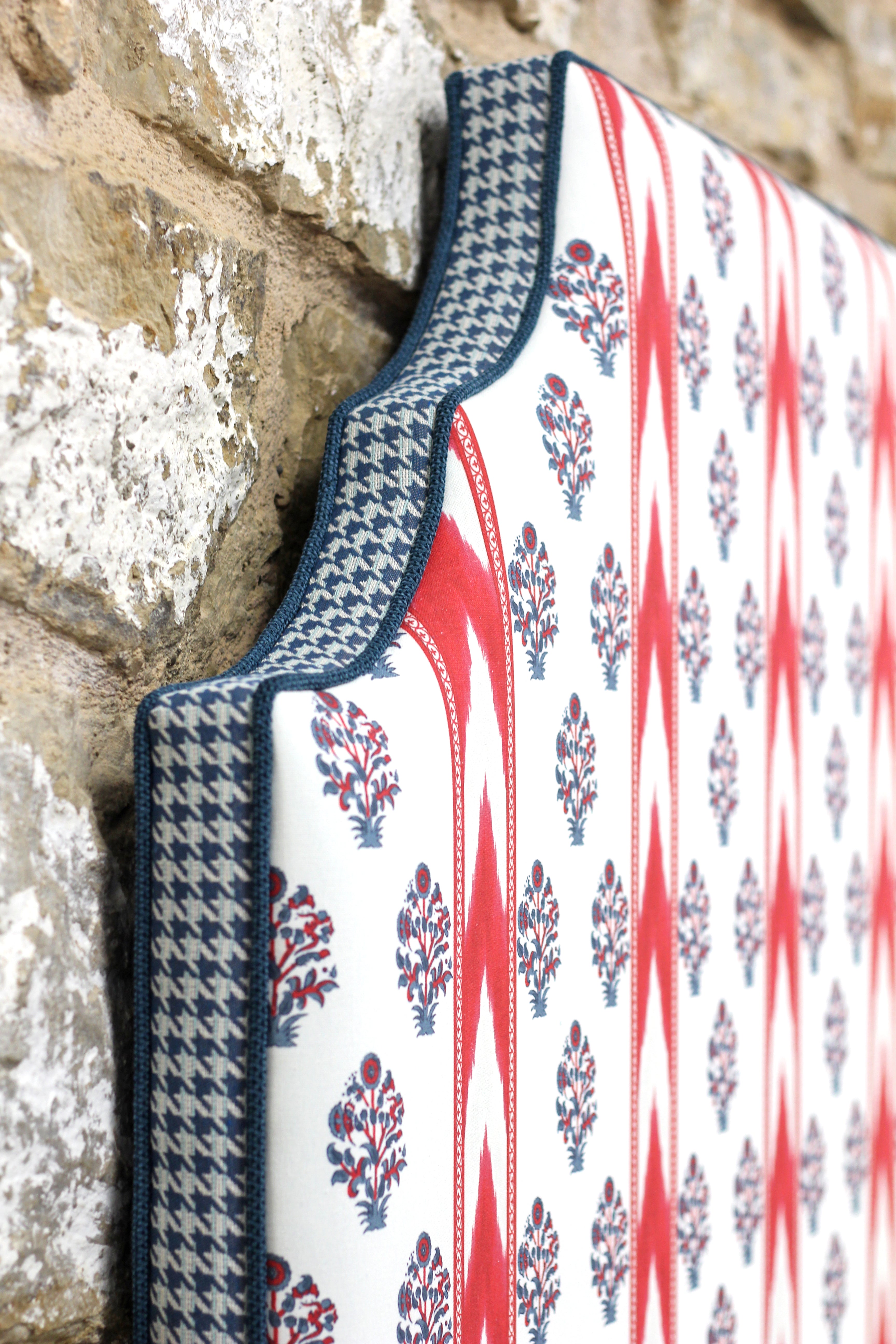 Cabecero de madera que combina tapicería de elementos étnicos con estampado escocés conocido bajo el nombre "pata de gallo".