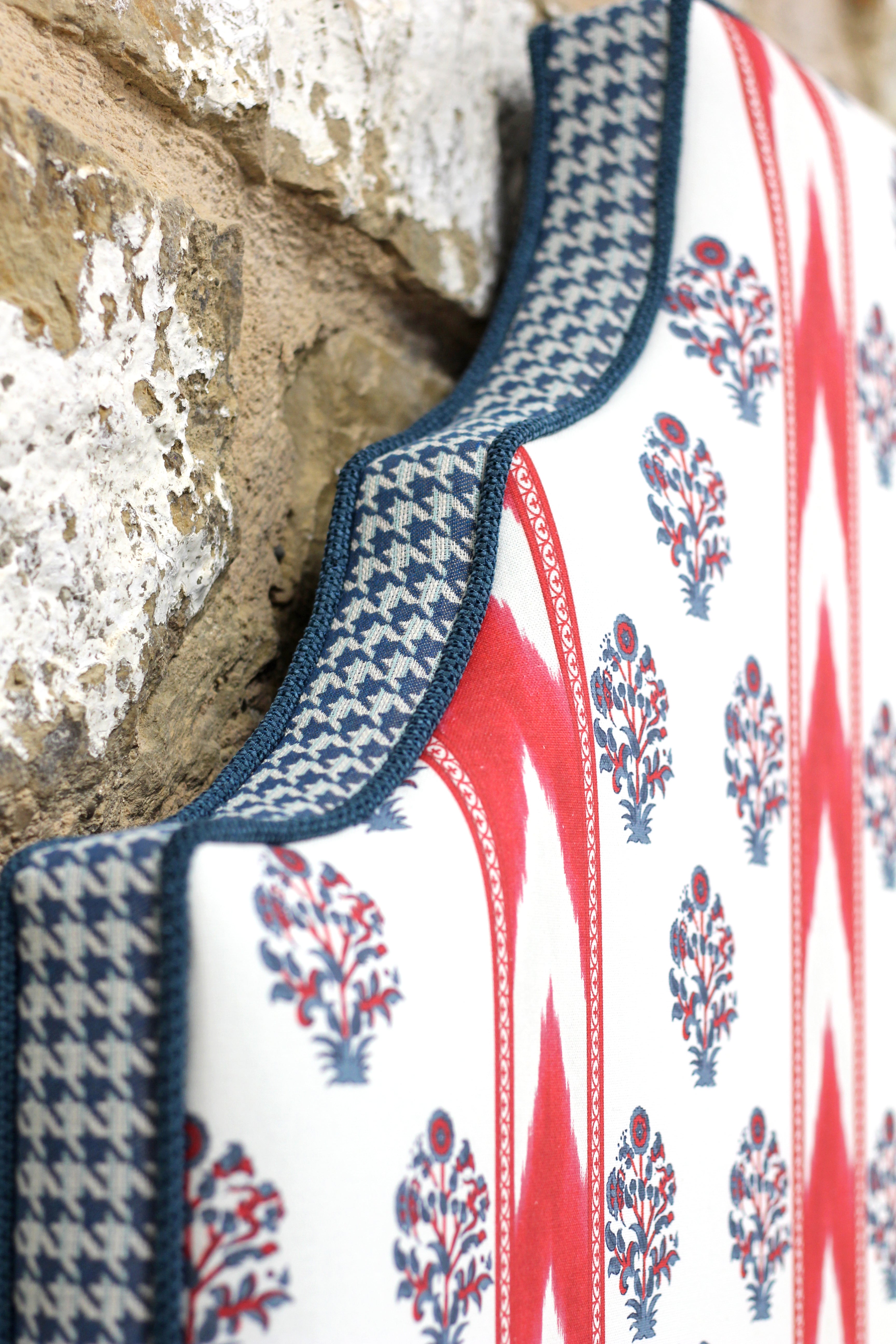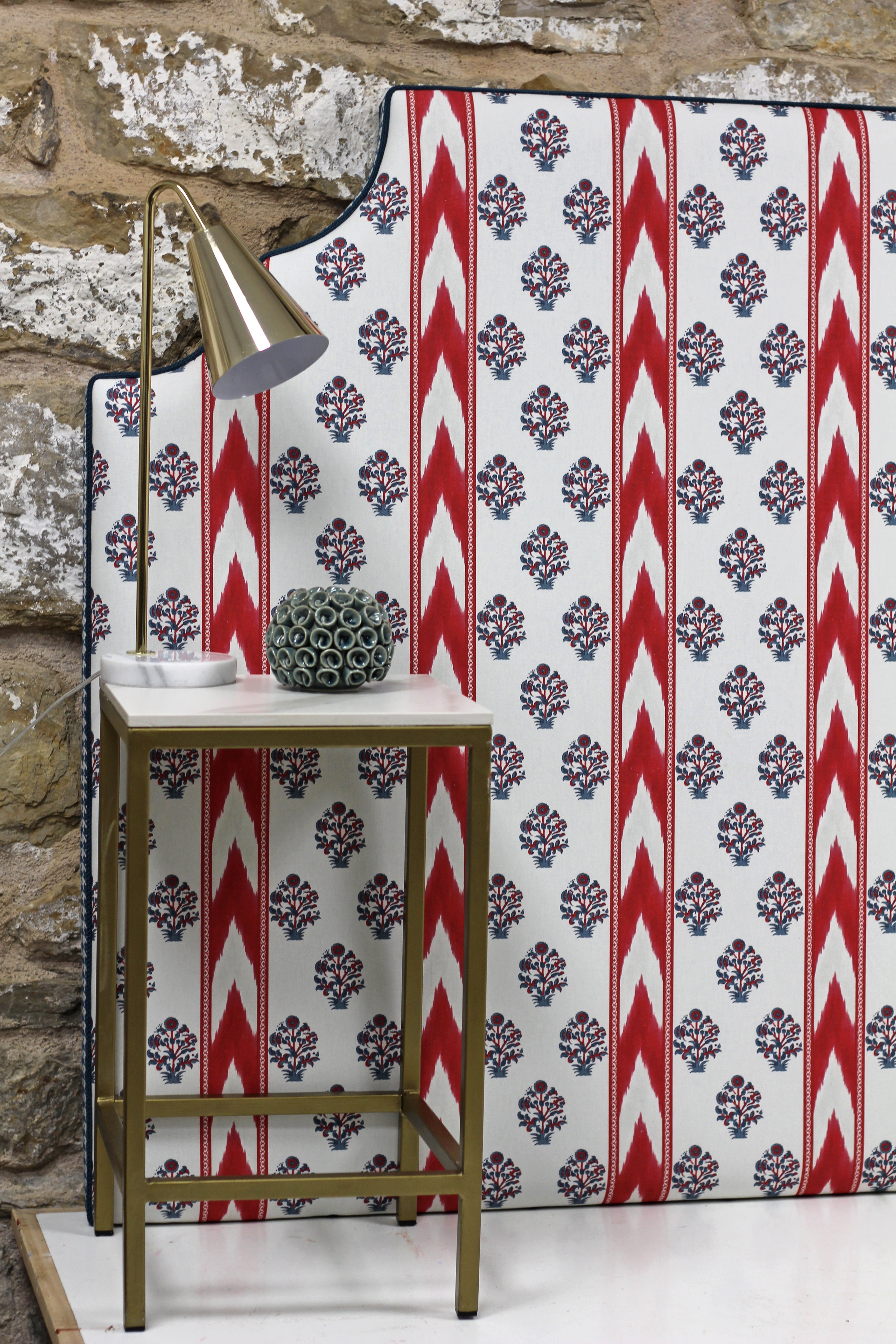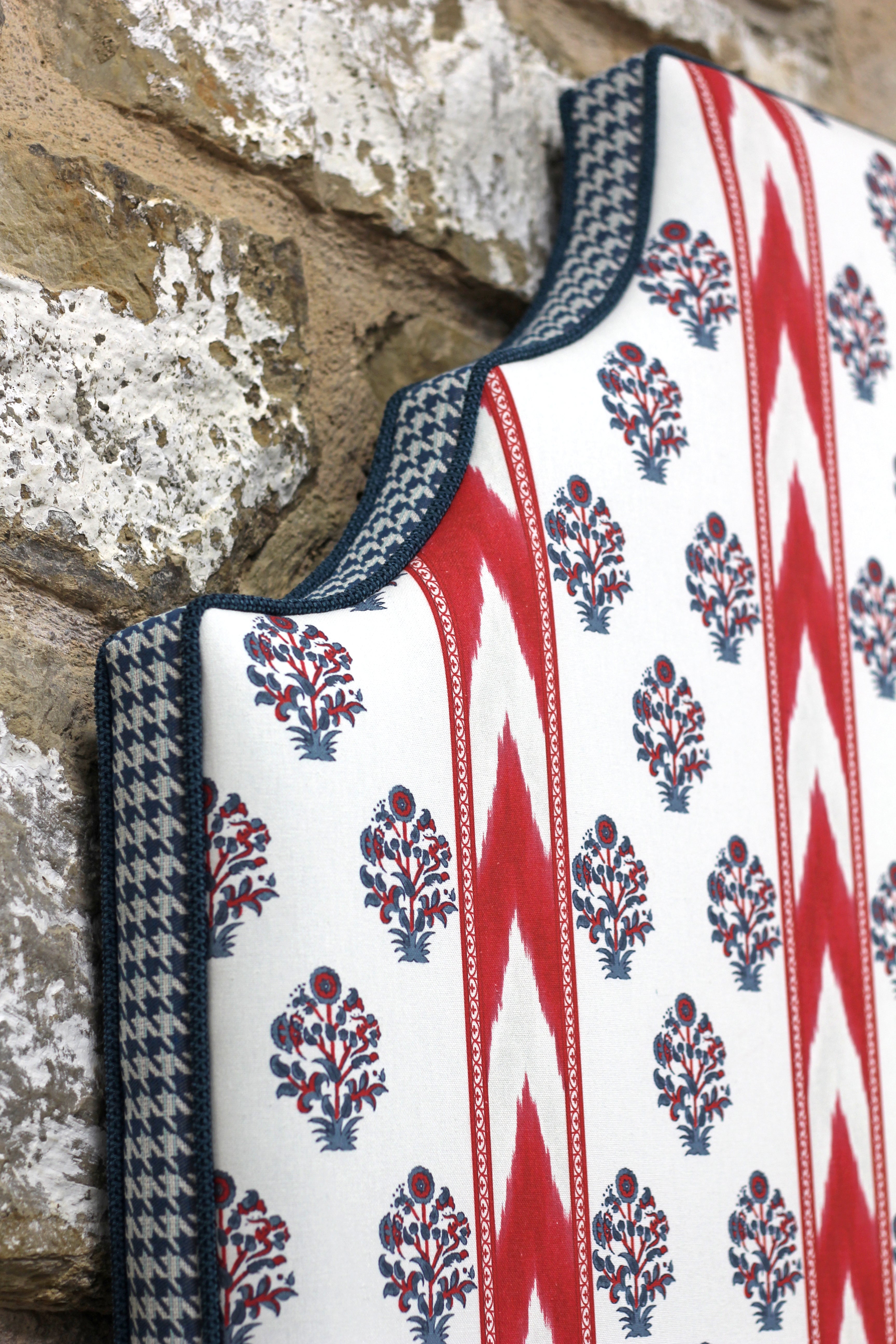 Cabecero de madera que combina tapicería de elementos étnicos con estampado escocés conocido bajo el nombre "pata de gallo".