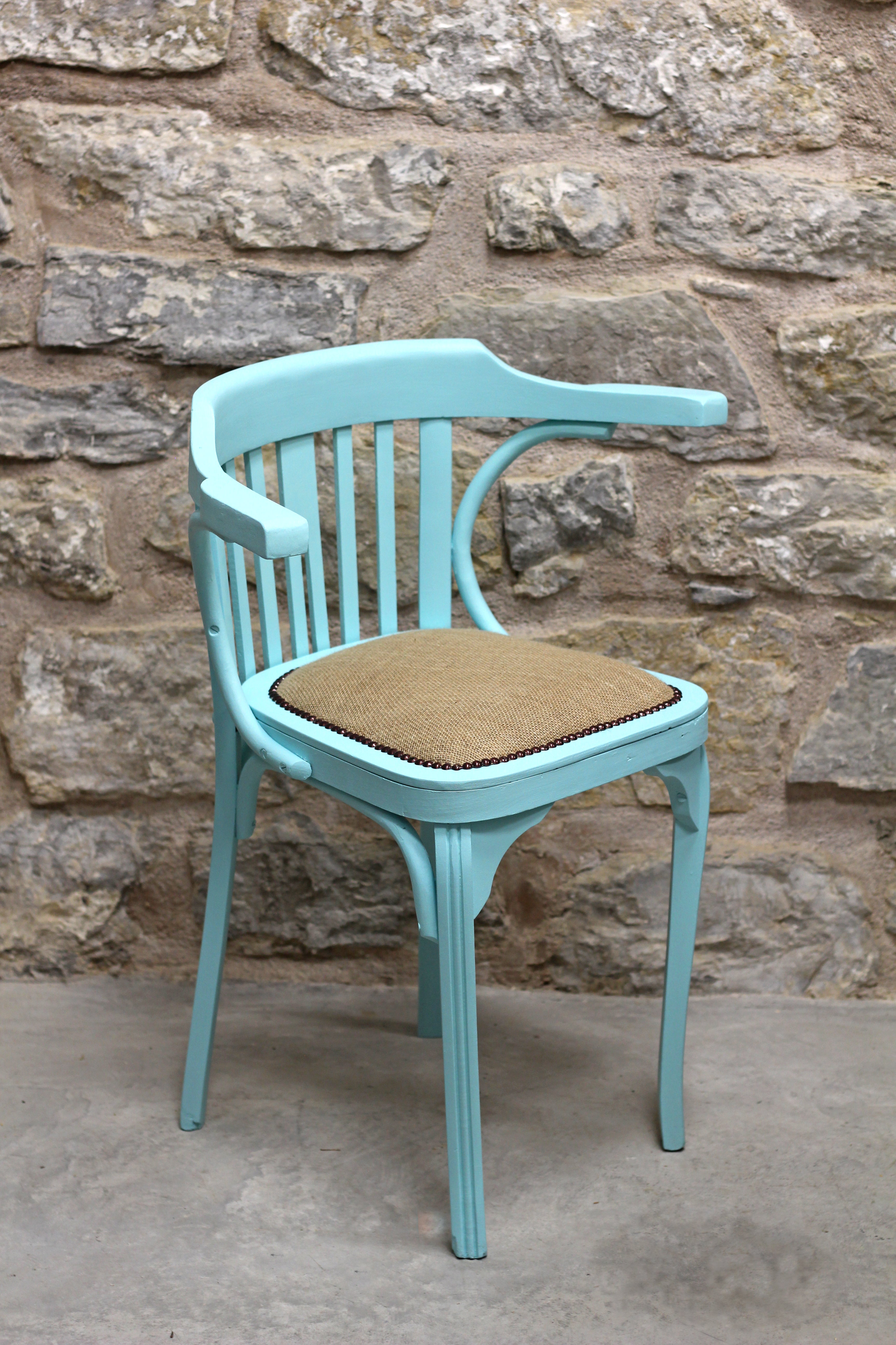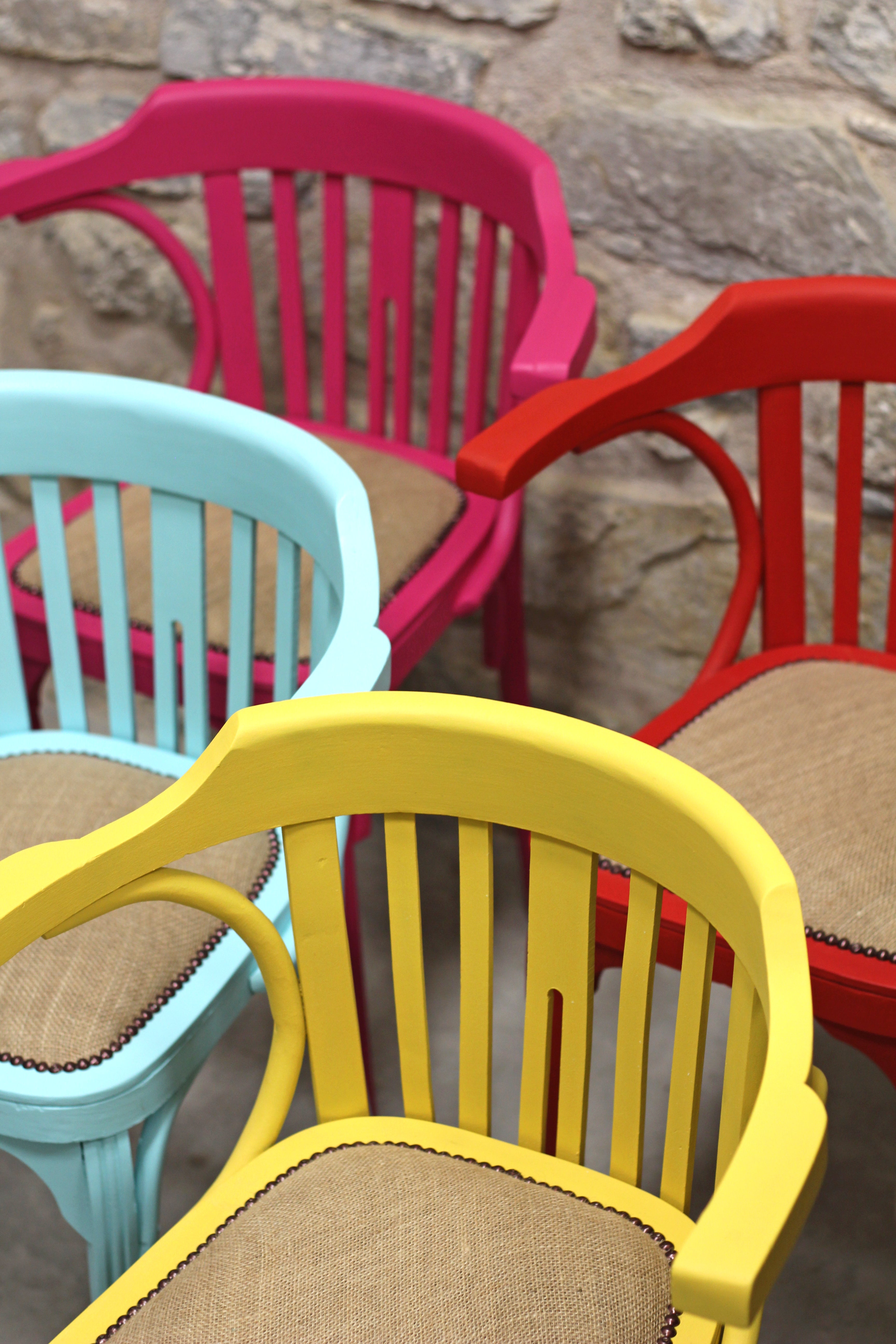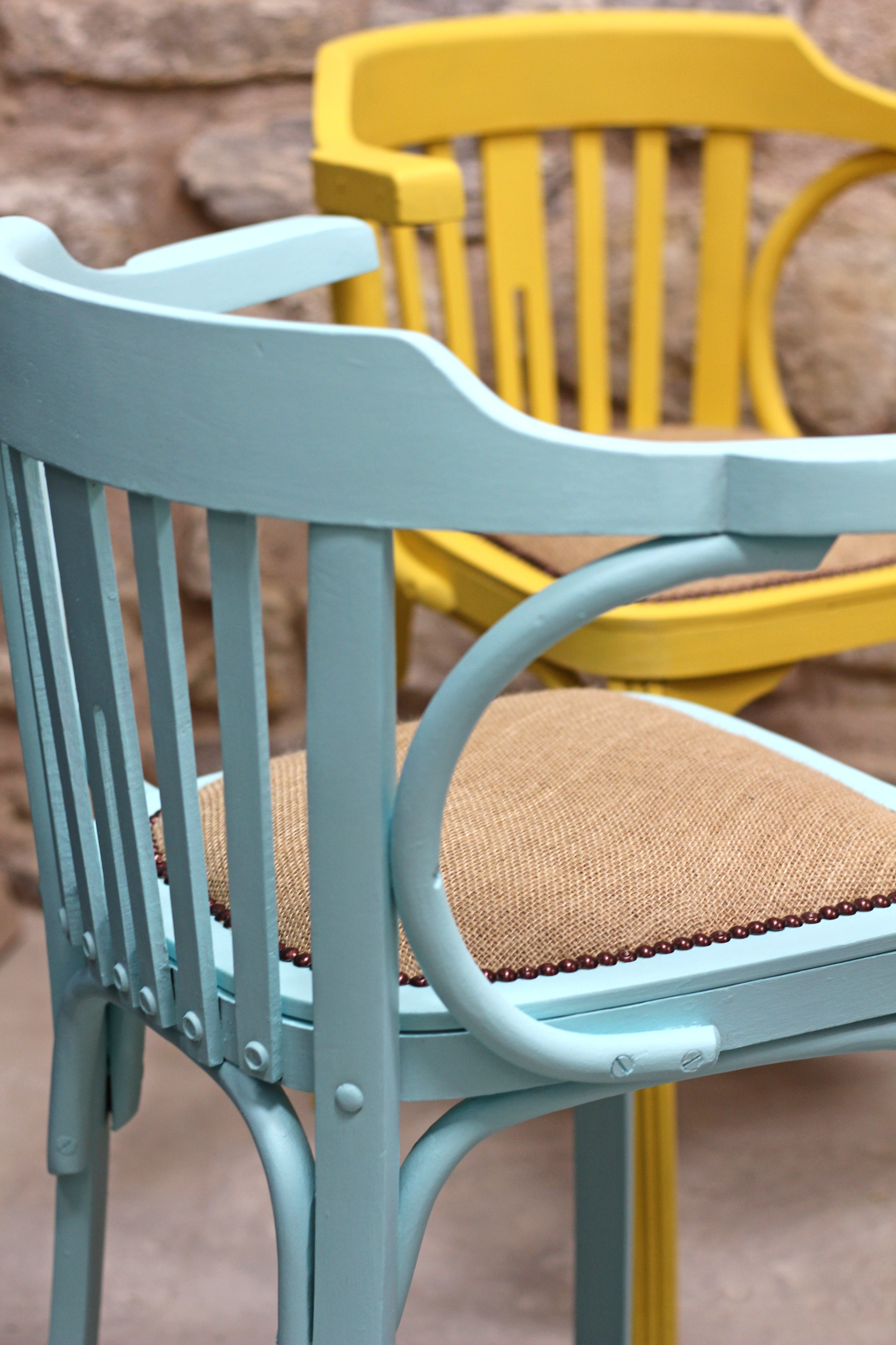 Conjunto de cuatro sillas completamente restauradas y transformadas para adquirir una apariencia totalmente distinta, mucho menos clásica.