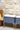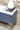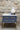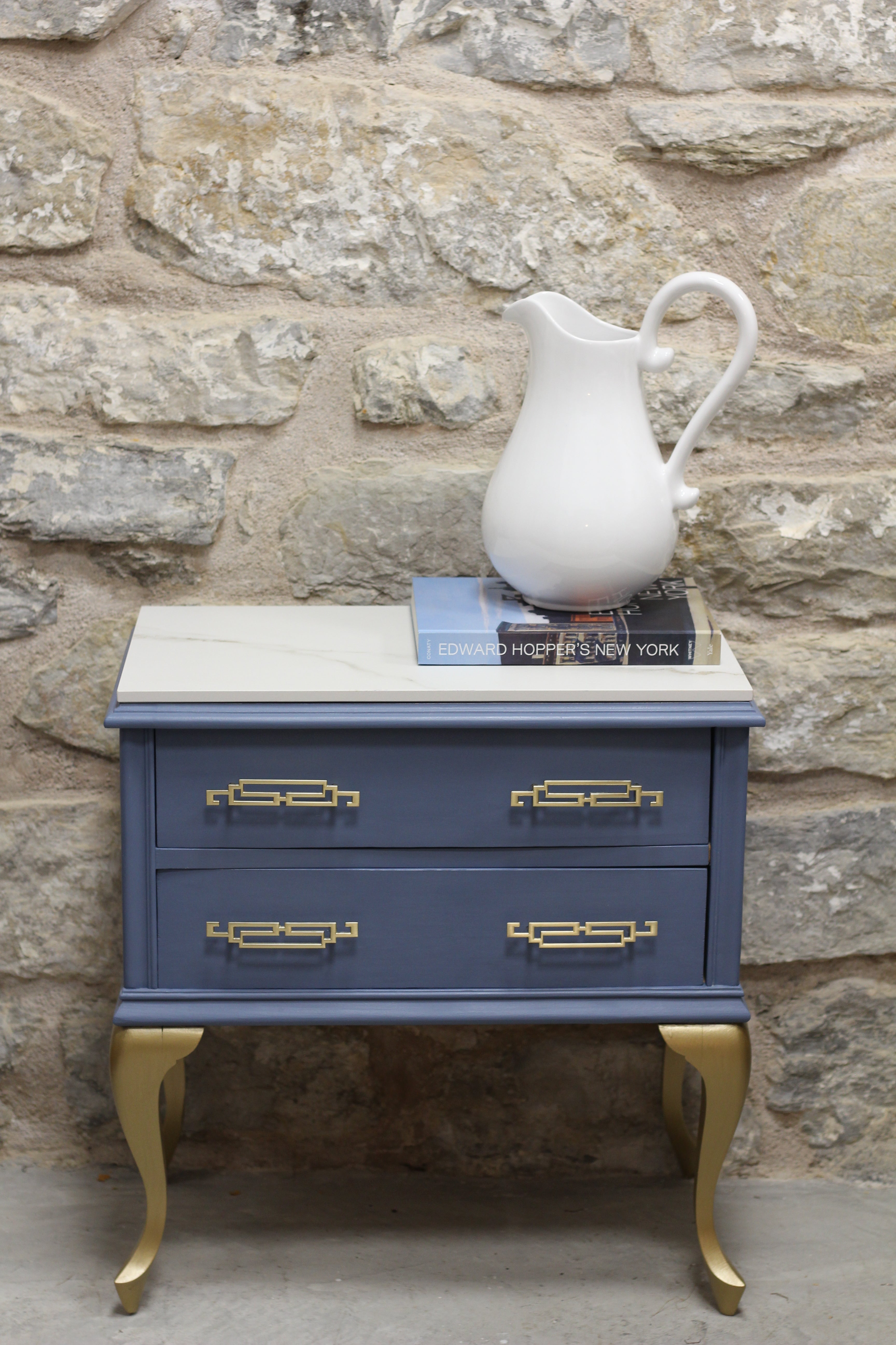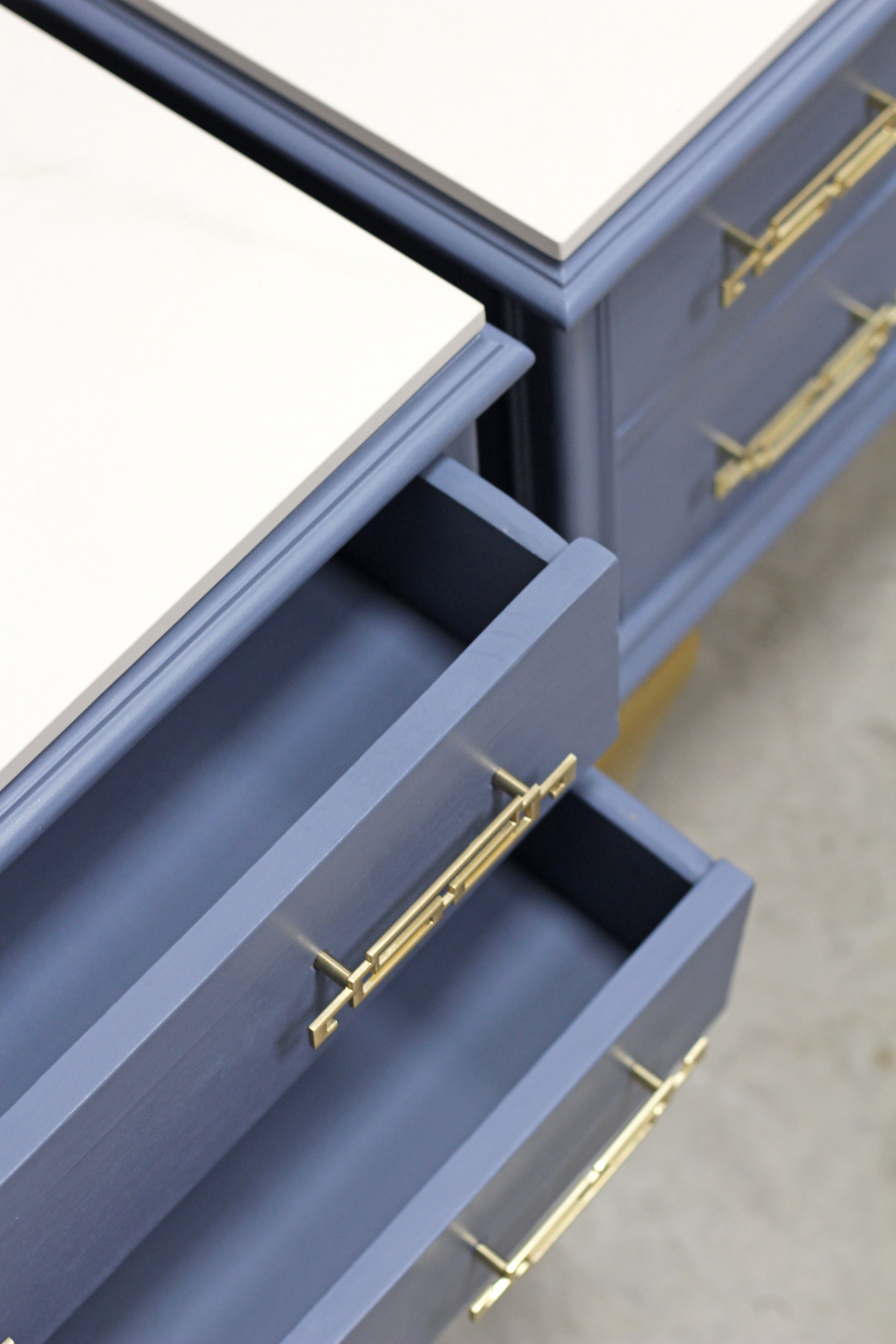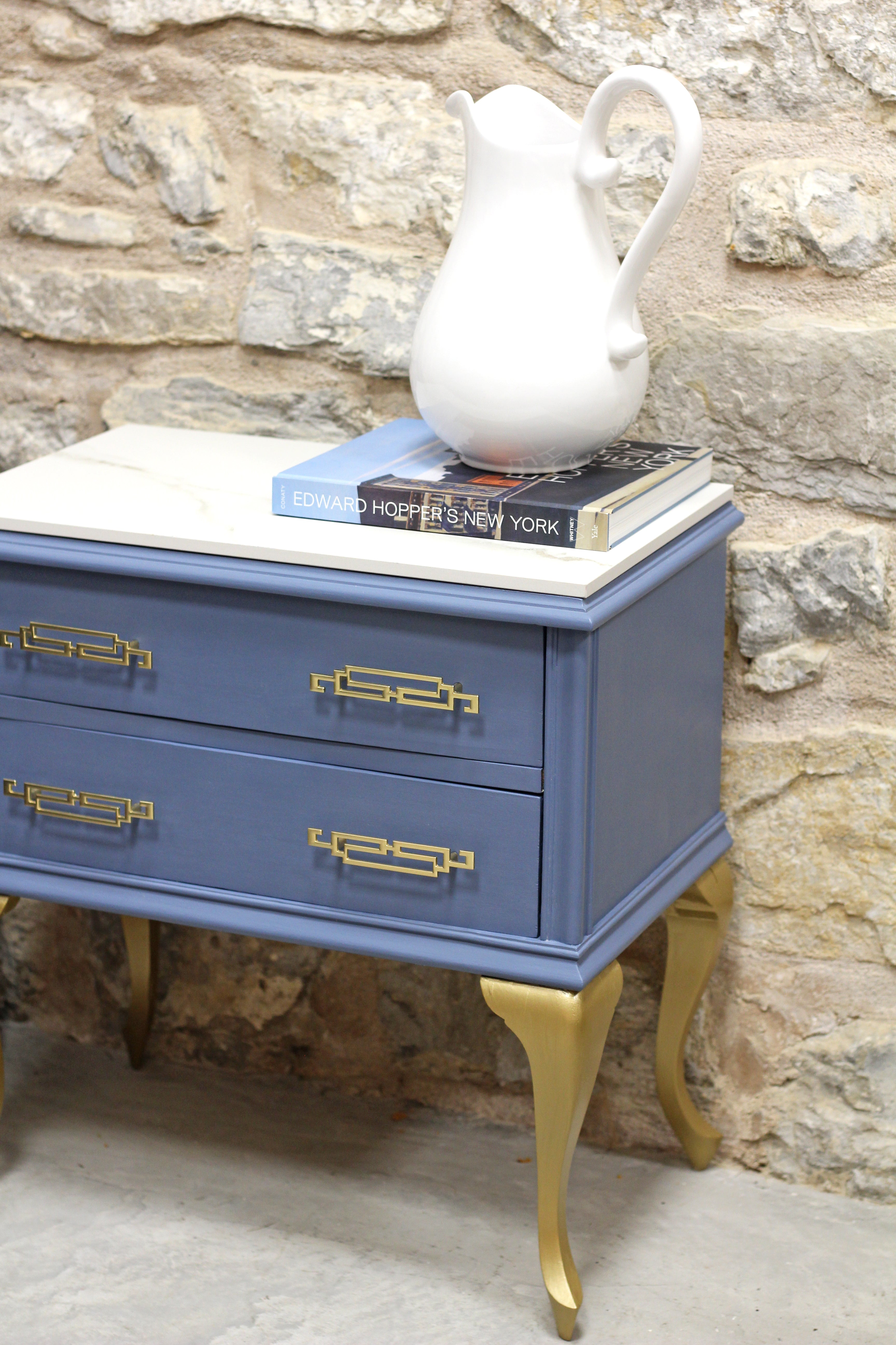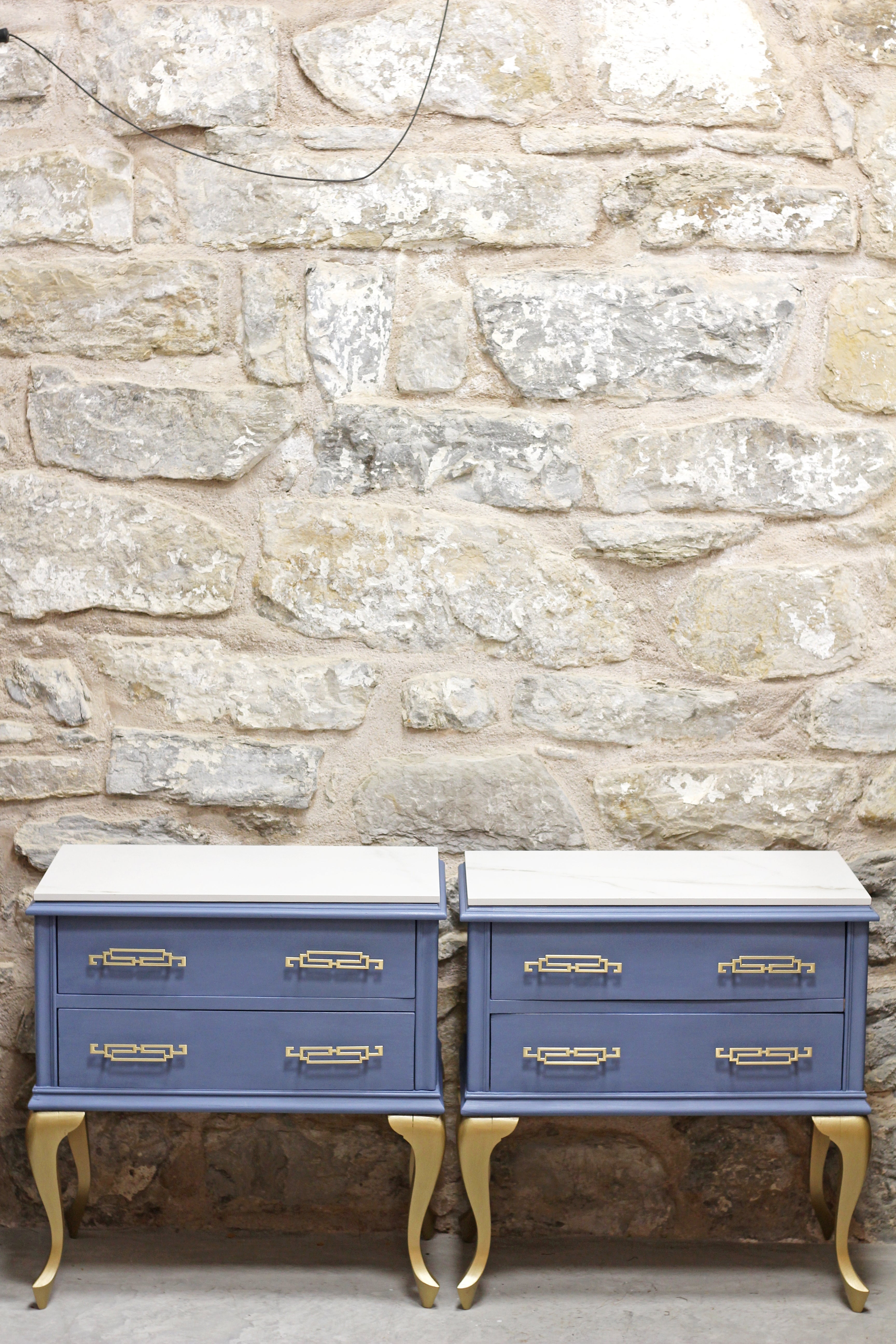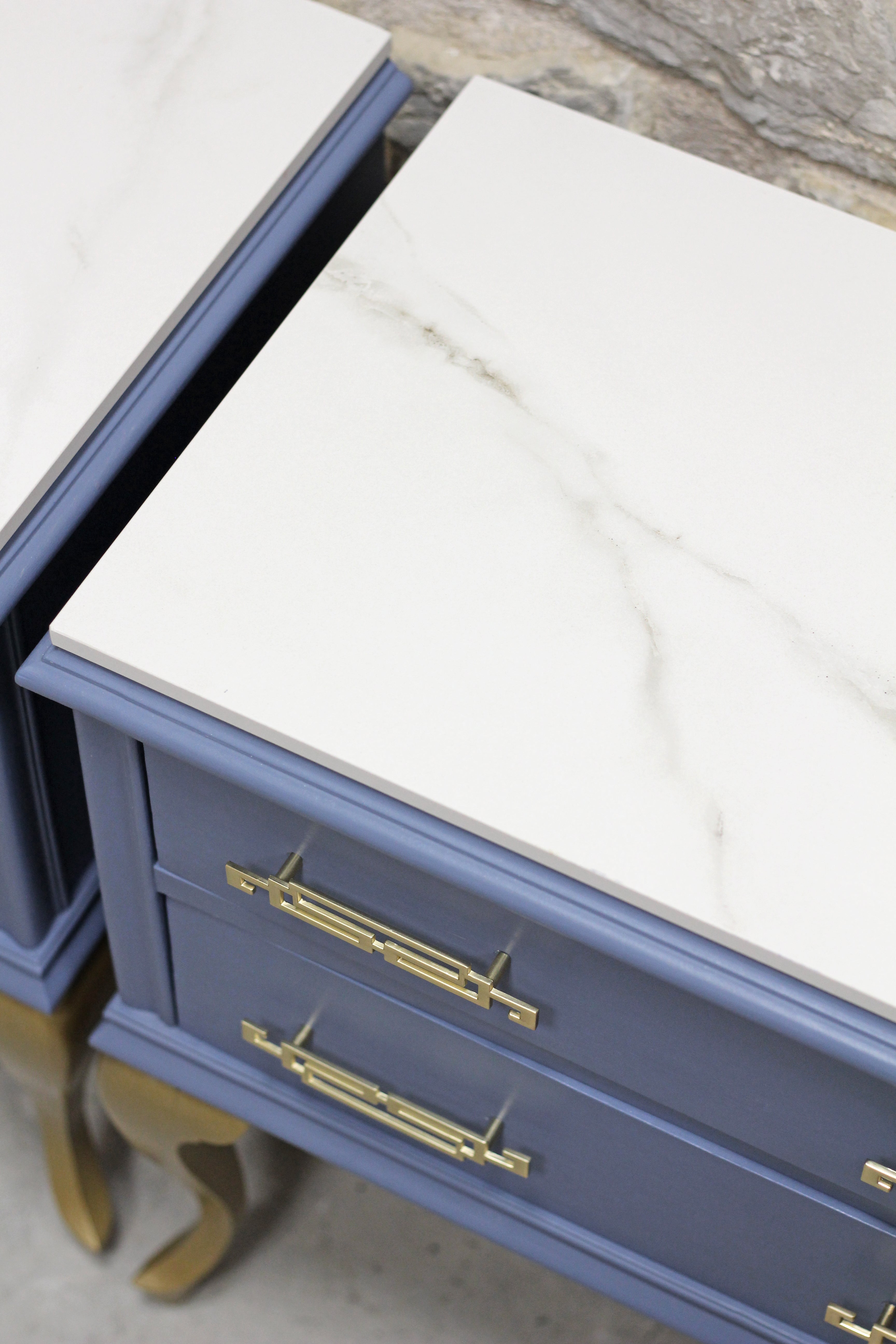 Conjunto de dos mesillas de madera en tono azul grisáceo (en fotos se percibe el color algo más saturado) con patas y tiradores dorados. Y rematadas ambas piezas con encimera de piedra.